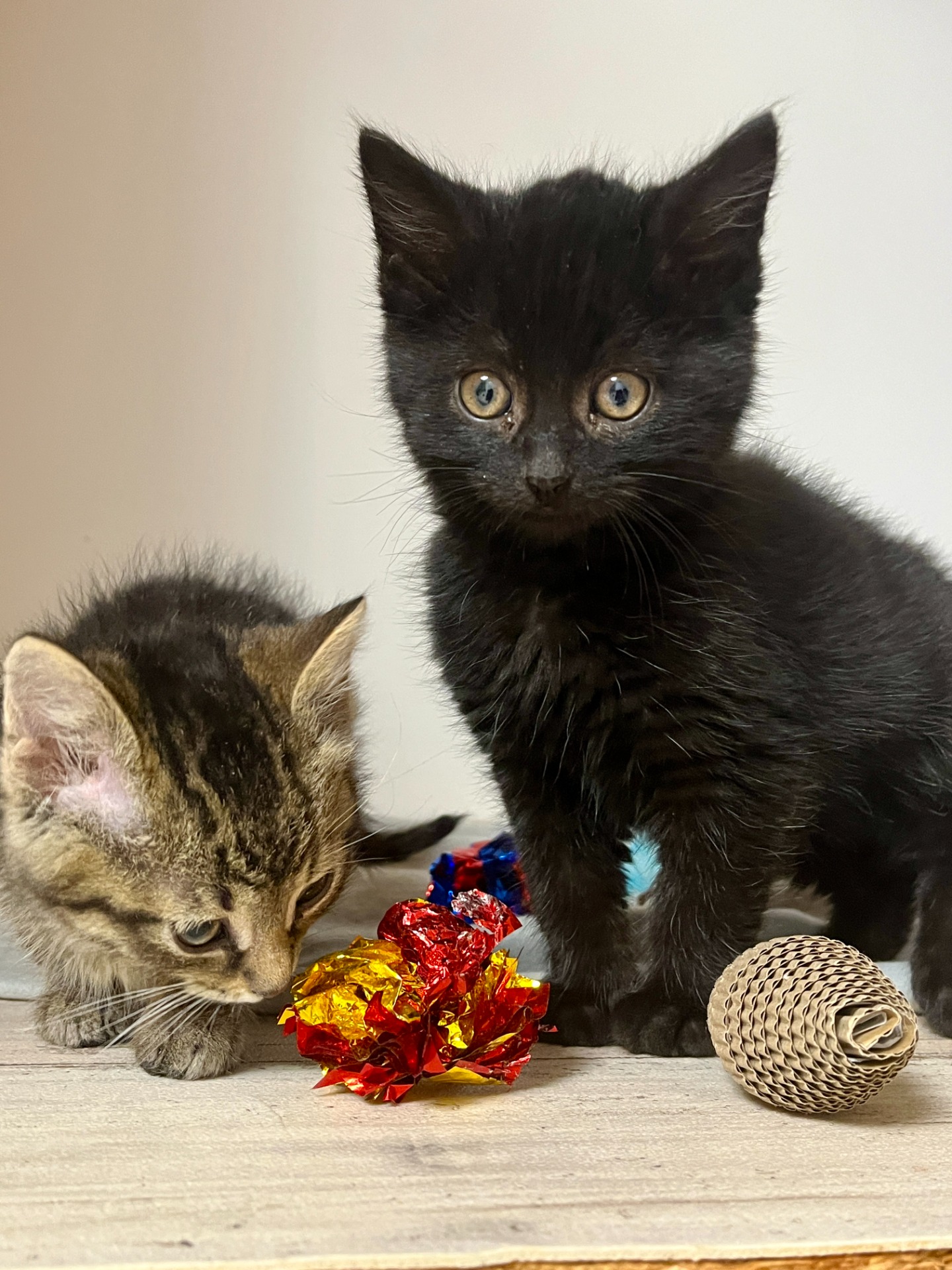 Tito dva sourozenci žili s ostatními v kolonii u rybníka ve Vroutku, kde po dohodě s městem, kočičky kastrujeme a vracíme zpět ven po kastraci. Krmí je tam majitelé zahrádek. Oba brali chvíli antibiotika na rýmu, nyní už jsou úplně zdravé, jsou jen trochu plaché, takže mazlíme :-) Věk 3 měsíce.